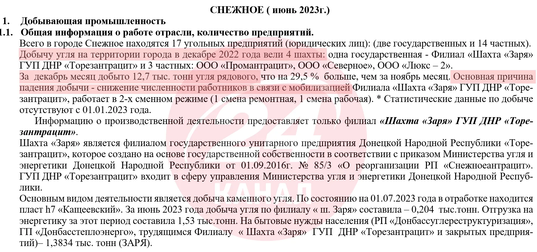 У червні 2022 року на шахті "Зоря" видобули лише 0,204 тисячі тонн вугілля, тоді як у 2013 році – середньомісячний показник склав 16 тисяч тонн / Скриншот документа з дампа відділу внутрішньої політики окупаційної адміністрації Сніжного