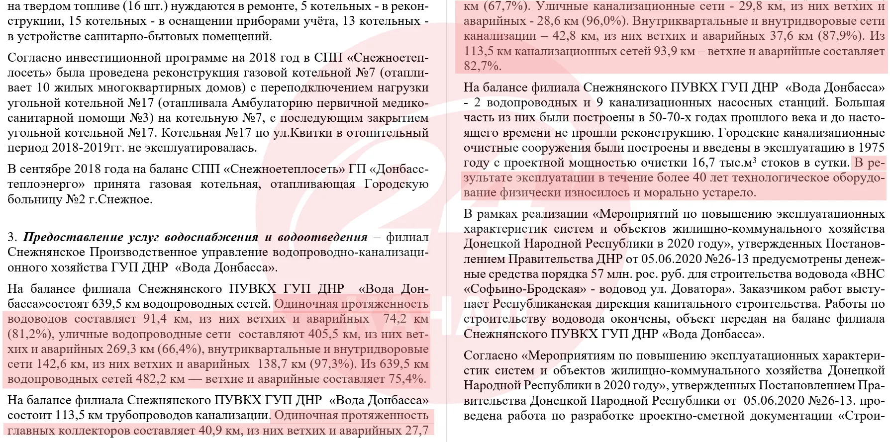 Окремою та дуже болючою для місцевого населення є ситуація з охороною здоров'я, станом об'єктів ЖКГ та водопостачанням. Адже з моменту створення "ДНР" ніякого хоч більш-менш серйозного ремонту трубопроводів та агрегатів ніхто не проводив. От і сталося так, що понад 75% водопровідних мереж у місті перебувають в аварійному стані. З каналізацією ситуація трохи гірша – там на межі прориву перебувають майже 83% труб. Втім, проблем із проривами труб у "республіці" фактично нема. Бо там нема води.