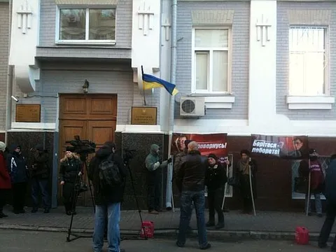 У руках вони тримають фото екс-чиновника та плакати з написами: "Я повернусь", "Свободу Луценку", "Борітеся — поборете!", а також плакати "Народної самооборони".