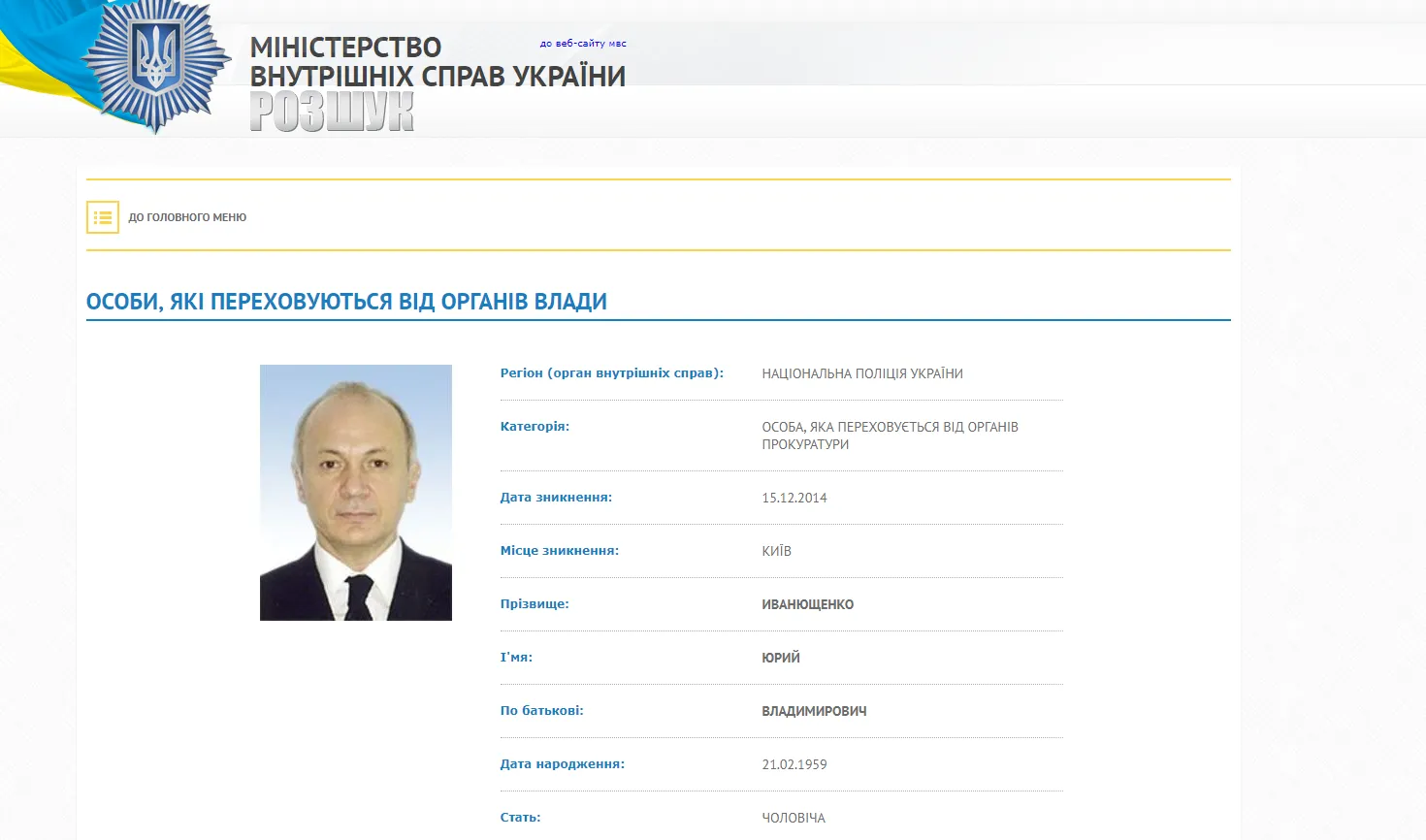 Про повернення в розшук екс-нардепа, відомого під прізвиськом "Юра Єнакієвський", свідчать дані на сайті МВС.