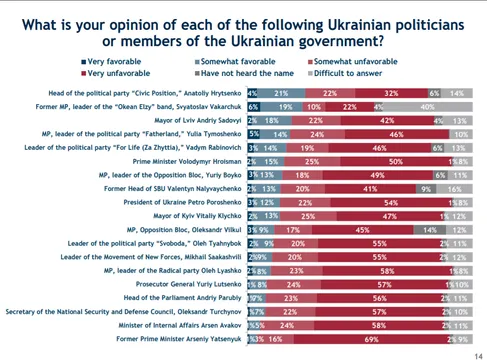 В цілому, з 19 учасників рейтингу лише п'ятеро показали позитивну динаміку – Анатолій Гриценко (25%, зростання на 2%), Андрій Садовий (20%, зростання на 1%), Юрій Бойко (16%, зростання на 2%), Валентин Наливайченко (15%, зростання на 2%) і Олександр Вілкул (12%, зростання на 3%).