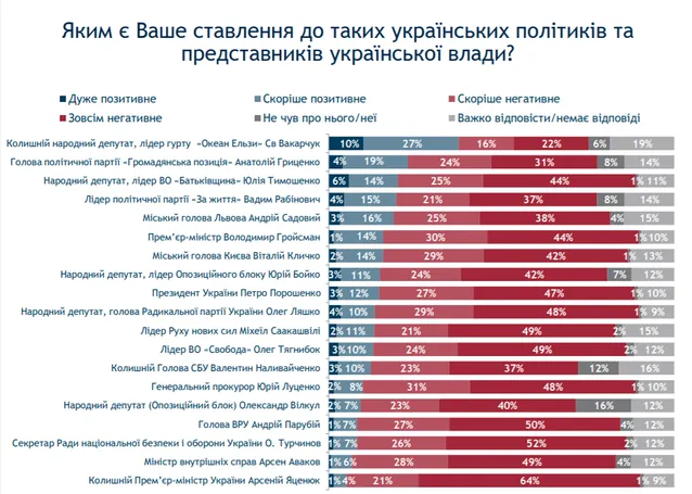 Троє учасників першої п'ятірки – Вакарчук (падіння на 12%), Тимошенко (падіння на 1%) і Рабинович (падіння на 2%) – погіршили свої показники в порівнянні з аналогічним рейтингом, опублікованим IRI в жовтні 2017 року.