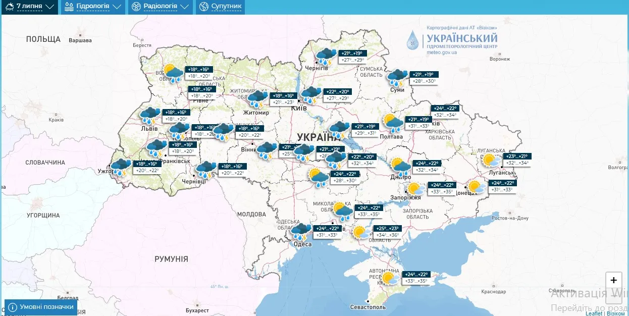 Прогноз погоди на 7 липня / Скриншот з сайту Укргідромедцентру