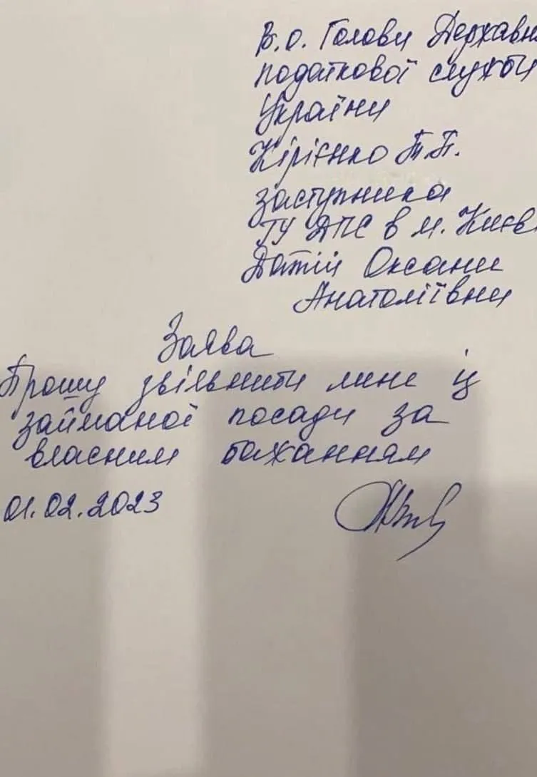 Судячи з заяви, Датій звільнилась ще 1 лютого. Зауважимо, що саме у цей день українські спецслужби прийшли до чиновниці з обшуками.