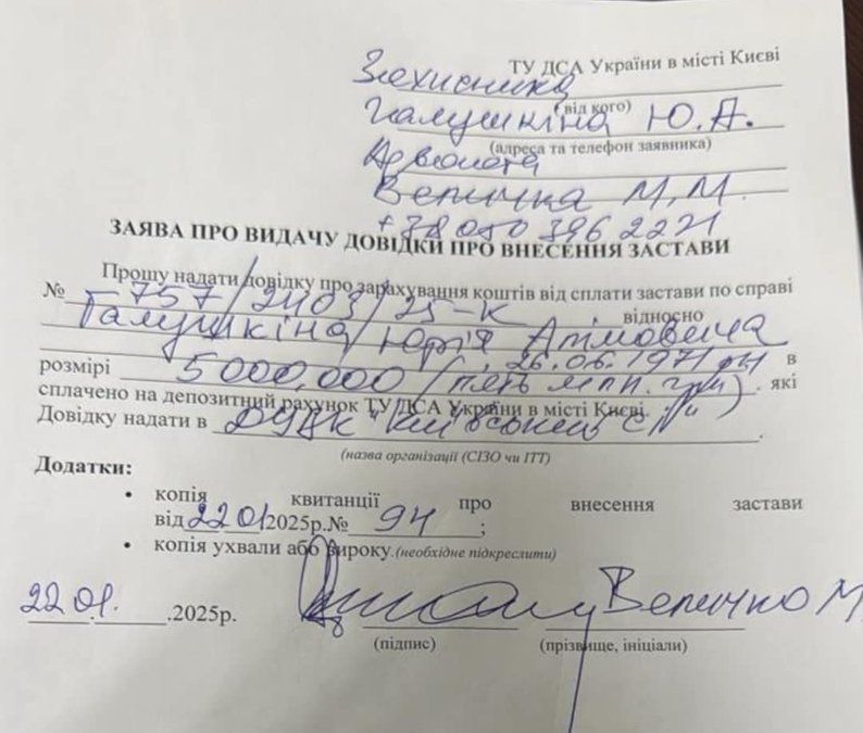 Заява про видачу довідки про внесення застави за Юрія Галушкіна / Фото Facebook/Михайло Величко