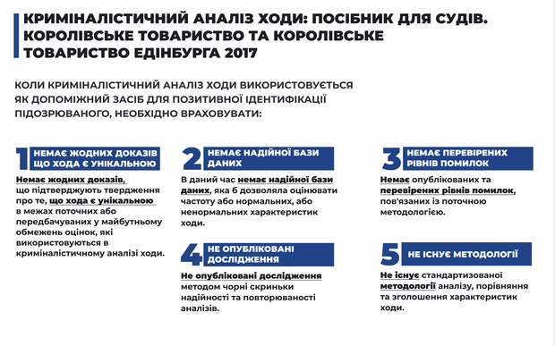 За словами адвоката Віталія Галенченка, у матеріалах експертиз є посилання на "Криміналістичний аналіз ходи. Підручник для суддів. Королівське товариство та Королівське товариство Едінбурга 2017". Утім, у ньому зазначається, що немає жодних доказів, що хода є унікальною, немає надійної бази даних, немає опублікованих та перевірених рівнів помилок. А також не існує стандартизованої методології аналізу та порівняння і зголошення характеристик ходи.