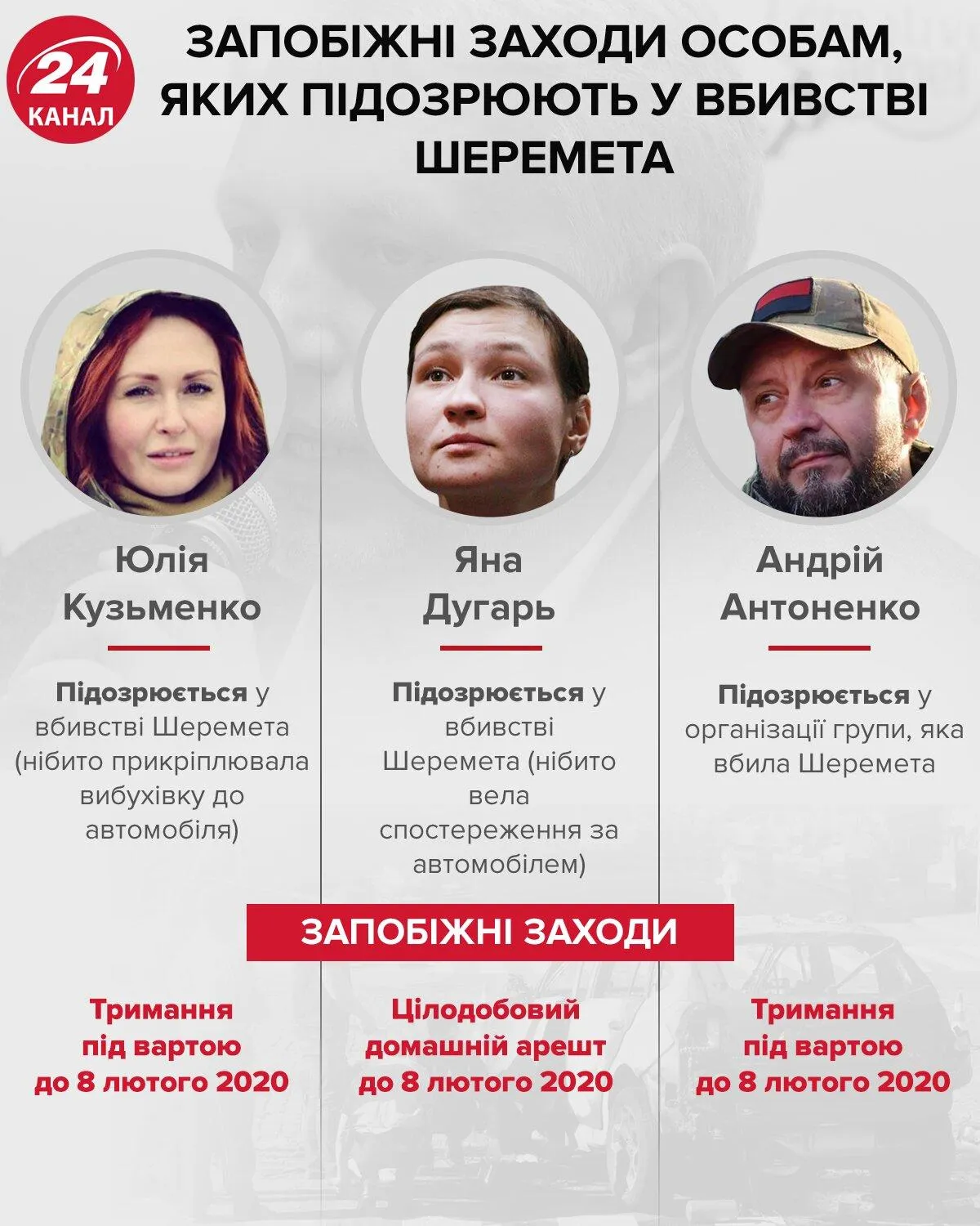 У вбивстві журналіста Шеремета підозрюють подружжя добровольців Владислава та Інни Грищенків, дитячого хірурга й волонтерку Юлію Кузьменко, військового медика Яну Дугарь і музиканта та військового Андрія Антоненка.