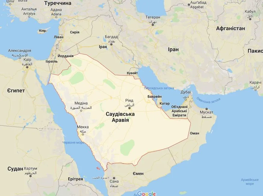 Розміщення Саудівської Аравії на Аравійському півострові / Google maps