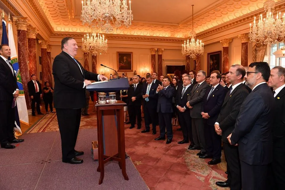 На фото – Совещание, которое 27 июня провел госсекретарь США М. Помпео по вопросам энергетической политики США.