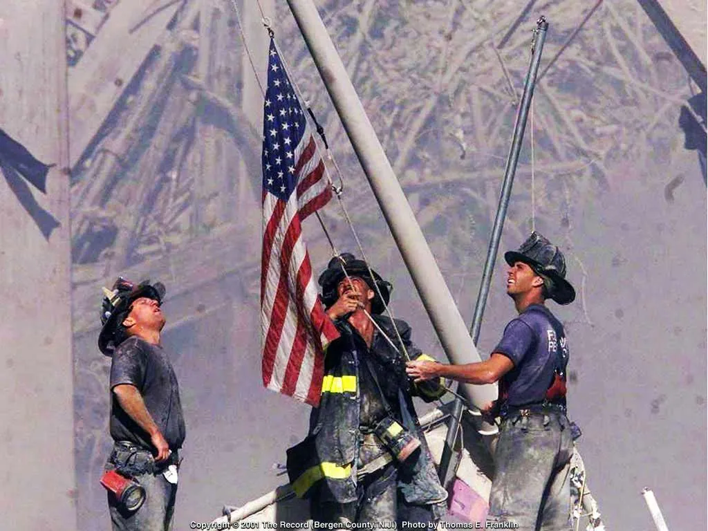 Пожежники піднімають прапор США над руїнами Нью-Йорку / Фото UrbanMatter