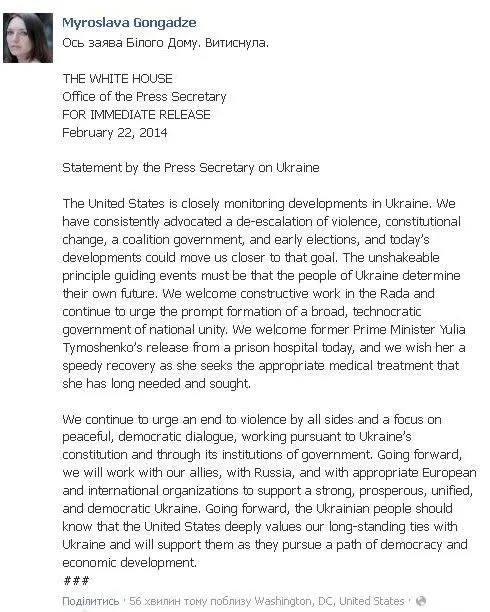 Заяву прес-секретаря Білого дому оприлюднила Мирослава Гонгадзе на своїй сторінці у Facebook.