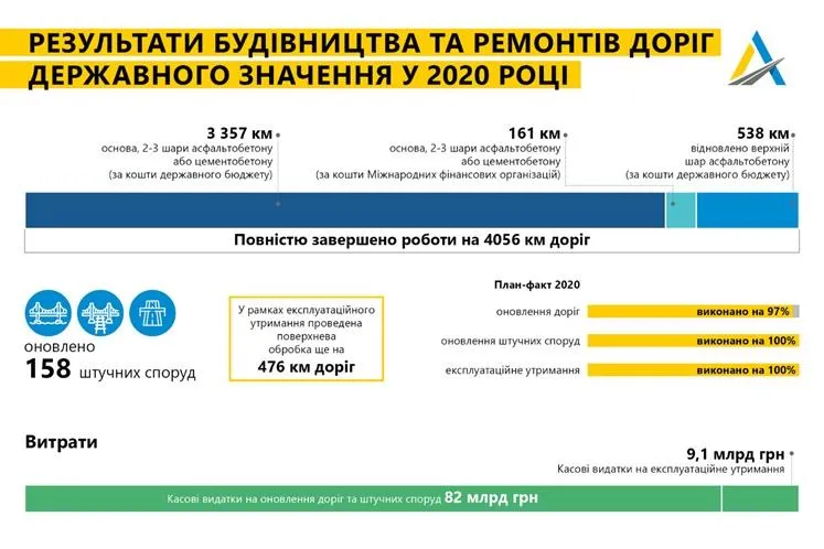 План-факт 2020: оновлення та будівництво доріг – 97%; оновлення штучних споруд – 100%; роботи в рамках експлуатаційного утримання – 100%,