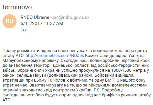 Від імені РНБО України журналістам надіслали повідомлення про те, що ніби сили АТО зайняли нові позиції на Маріупольському напрямку, вбивши 10 бойовиків.