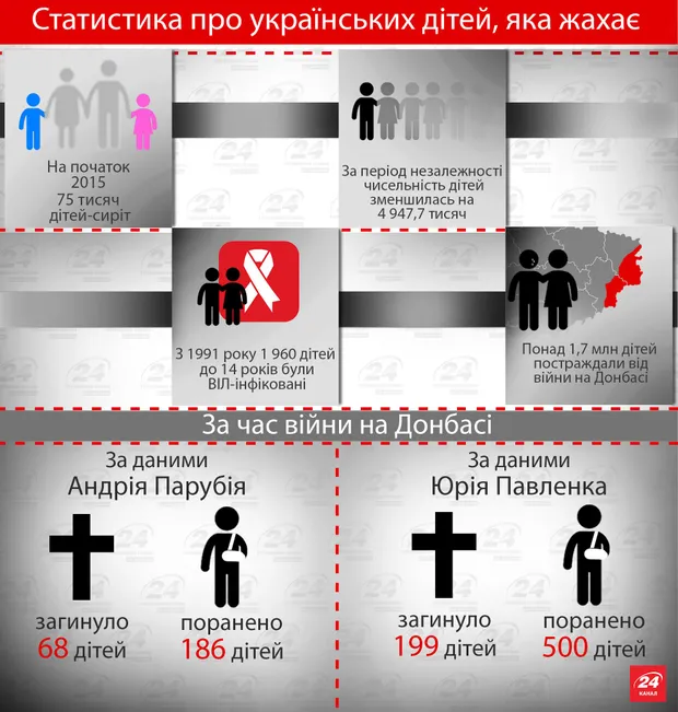 Понад 1,7 мільйона дітей постраждали від війни на Донбасі. За даними спікера Верховної Ради Андрія Парубія, за час війни загинуло 68 дітей, ще 186 отримали поранення.