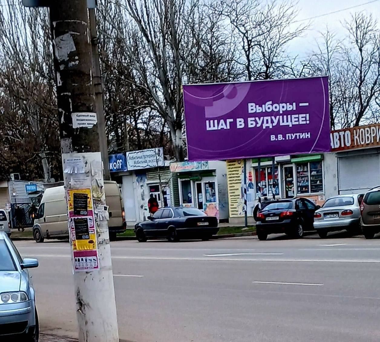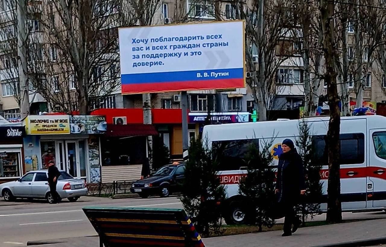 Для розуміння того, що відбувається в окупованих українських містах, наведемо фото. Загарбники роблять усе, щоб люди бачили прізвище Путіна навіть тоді, коли йдуть по хліб і молоко.