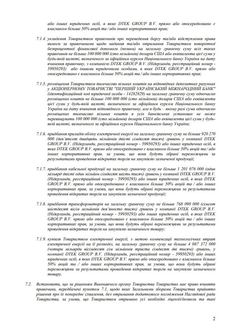 Згідно з документом, акціонери дали згоду на щедрий переказ коштів компанії DTEK GROUP B.V., зареєстрованій у Нідерландах, а також іншим юридичним особам, у яких компанія володіє корпоративними правами. АТ "ДТЕК Одеські електромережі" викупили у DTEK GROUP B.V. облігації на суму 20 мільйонів доларів.