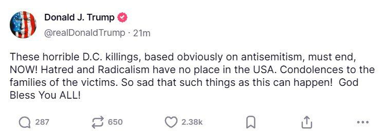 Ці жахливі вбивства у Вашингтоні, засновані, вочевидь, на антисемітизмі, мають припинитися зараз! Ненависті та радикалізму немає місця в США. Співчуття родинам жертв. Так сумно, що такі речі можуть відбуватися! Хай благословить вас всіх Бог!,