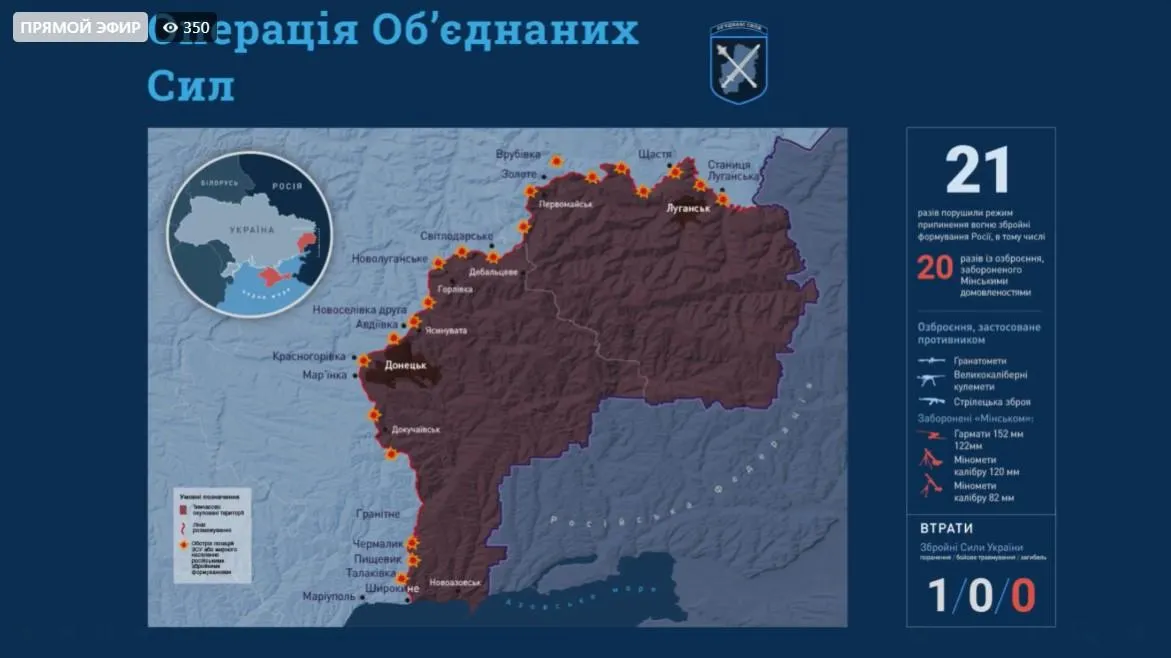 Станом на 12:00 21 лютого ворог вже 21 раз порушив режим припинення вогню, 20 з яких – з порушенням мінських домовленостей. Проросійські бойовики гатили з: