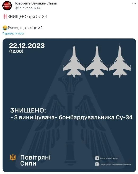 - У Повітряних силах 22 грудня офіційно заявили, що близько опівдні 22 грудня українські захисники збили три ворожі винищувачі-бомбардувальники Су-34. Як повідомив Микола Олещук, ворог зазнав втрат на Півдні України.