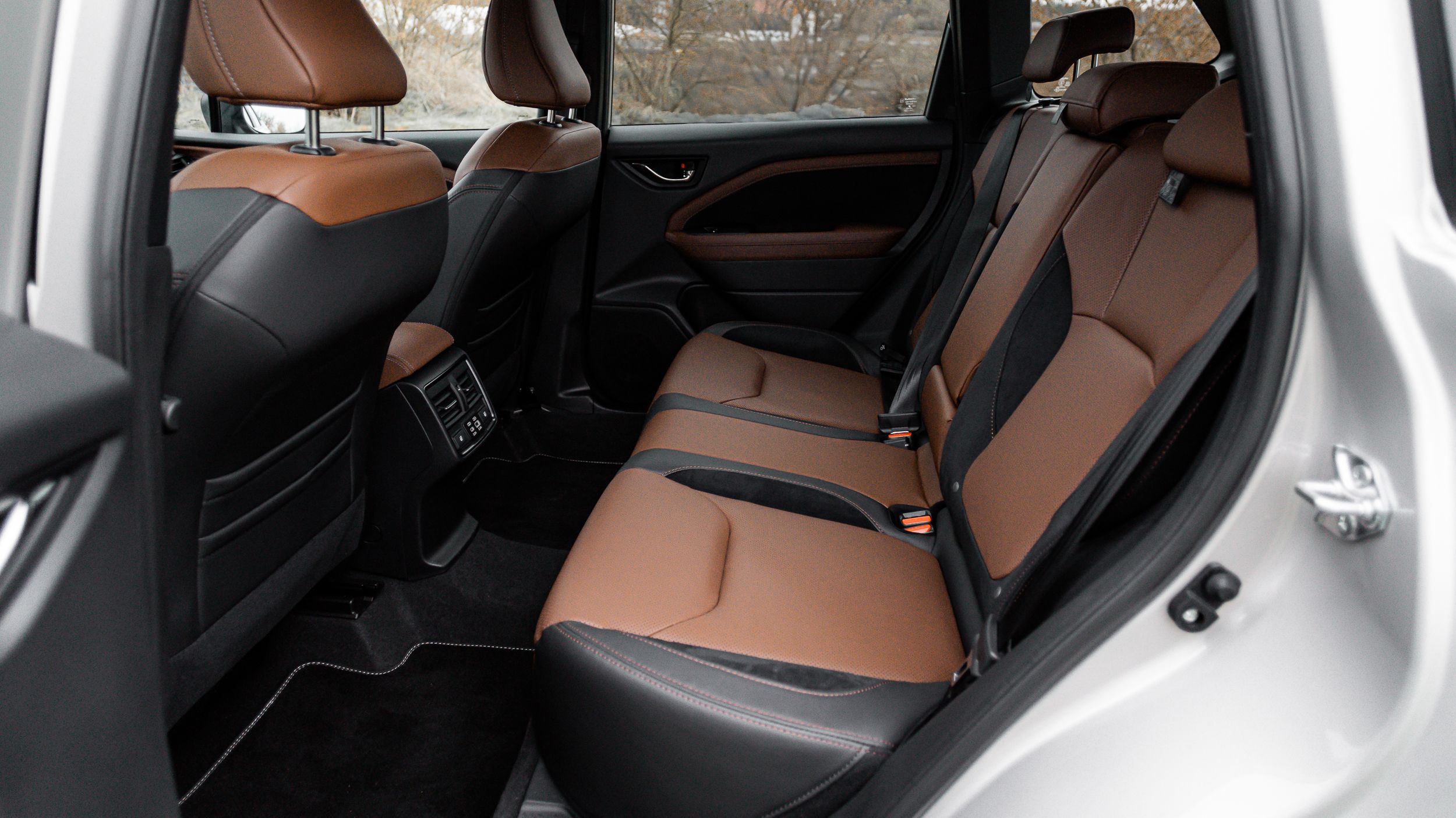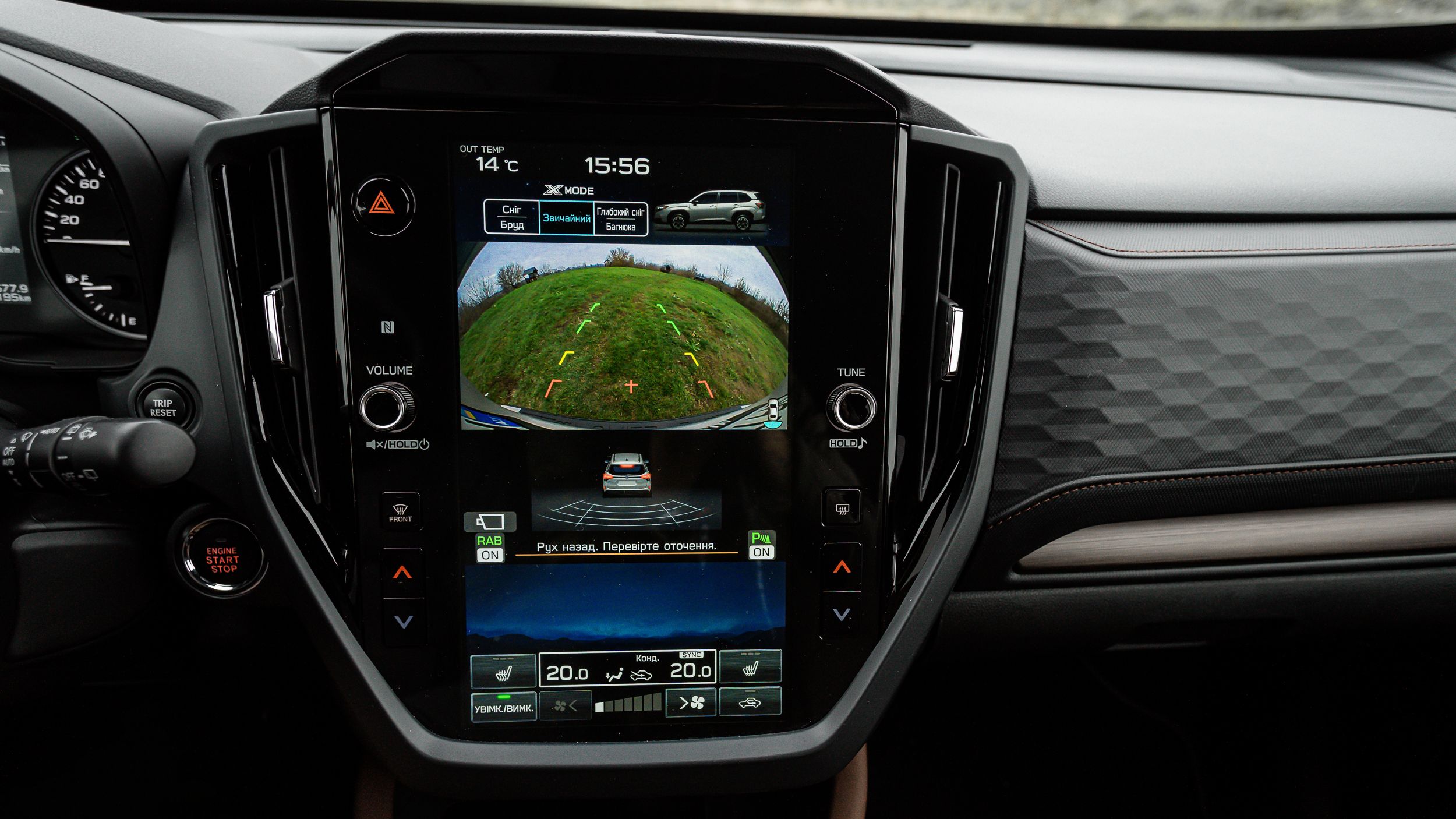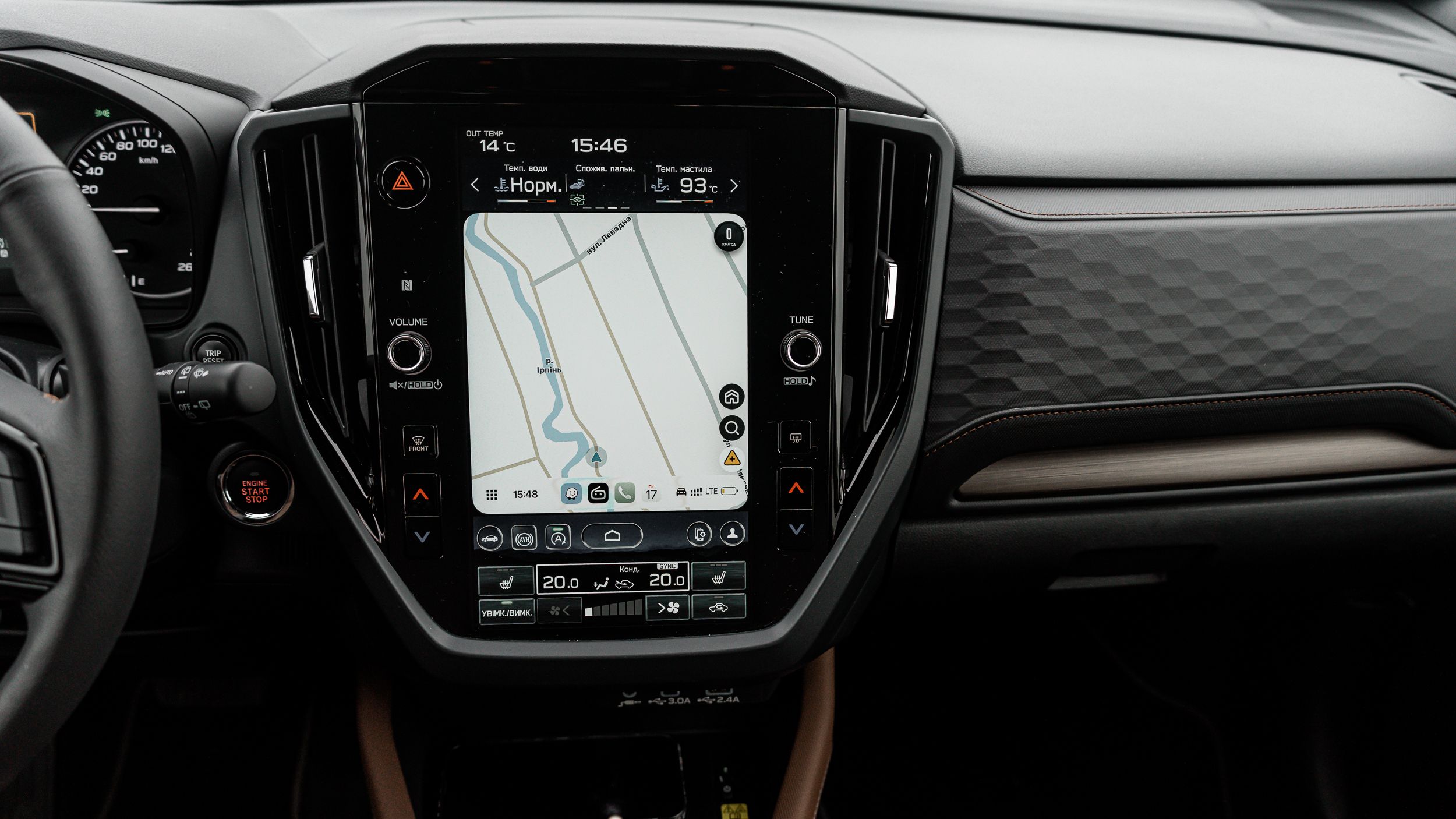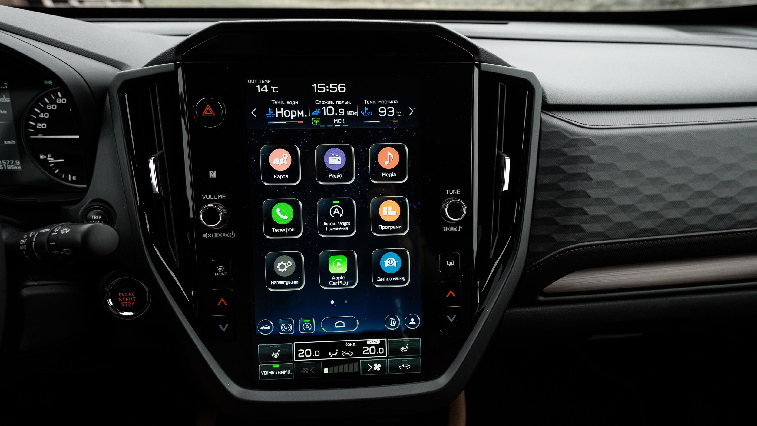 Apple CarPlay / Android Auto тут безпровідні, працюють без нарікань. Поличка для індукційної зарядки смартфона – на місці, і дуже зручному. А головне – Subaru пам’ятає, що в нас зими бувають справжні: підігрів передніх та задніх сидінь, керма, двозонний клімат – усе є, принаймні в цій комплектації. Не забули і про смартфони: для кожного ряду є по два роз’єми USB (Type-A і Type-C).