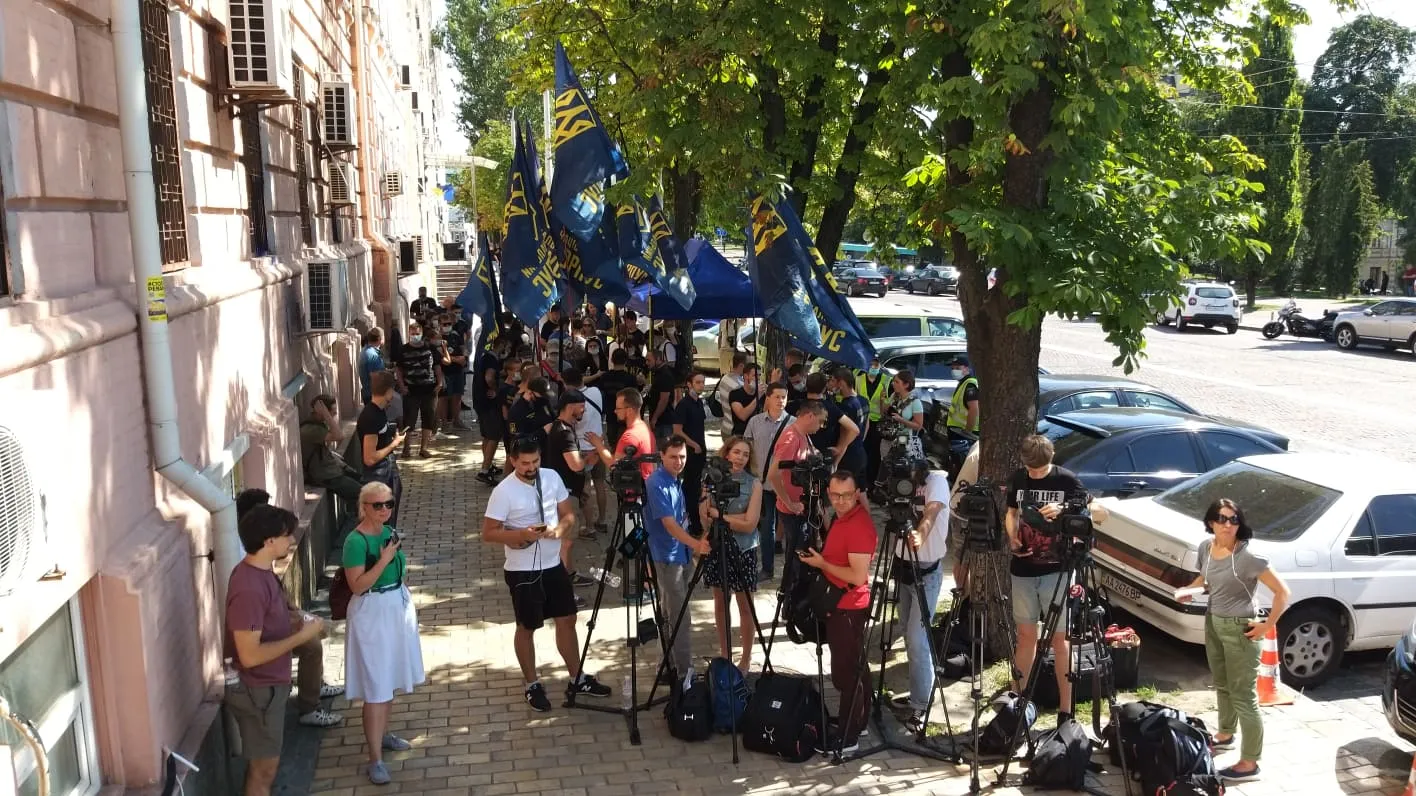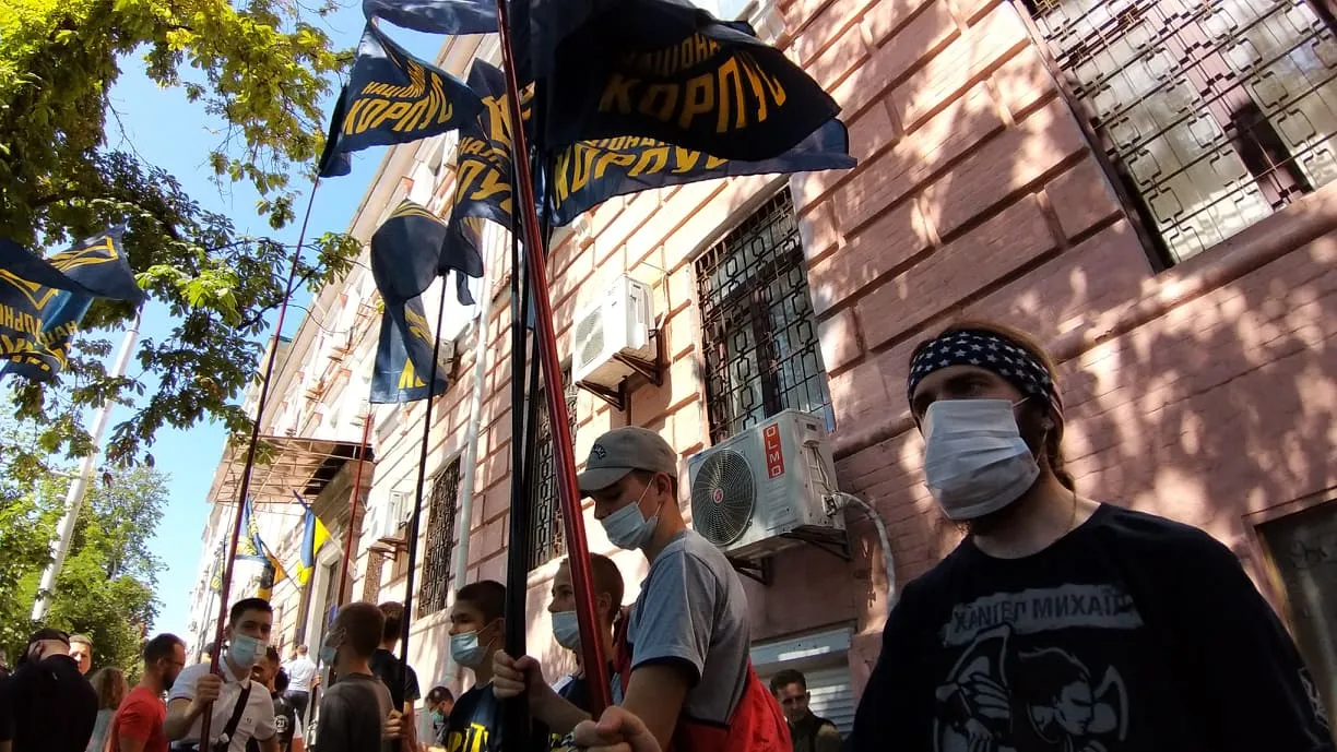 Під будівлею суду прийшли приблизно сотня представників "Нацкорпусу", аби підтримати колег. Вони мали прапори та іншу символіку. Також облаштували намет.