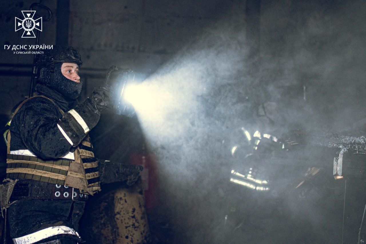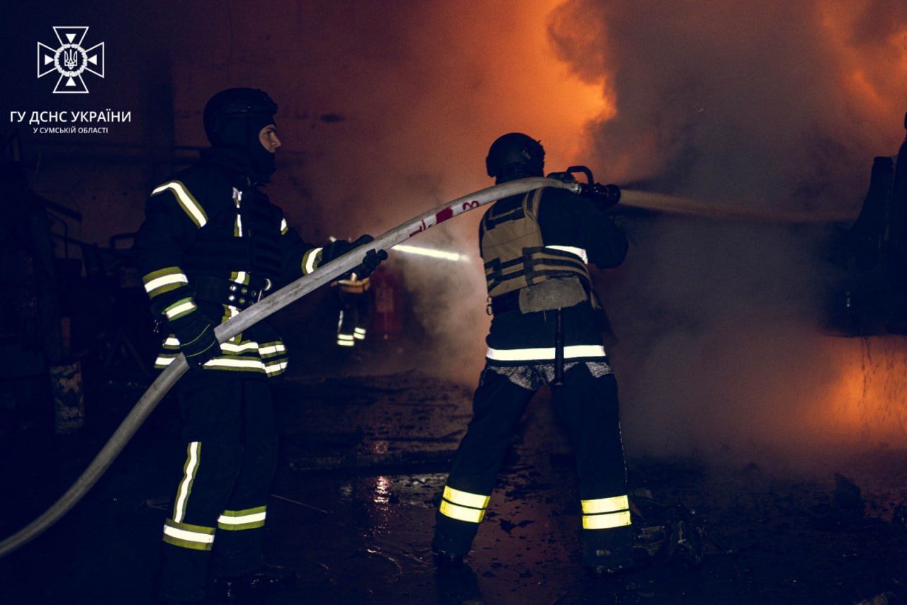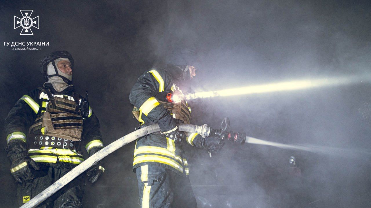 Рятувальники гасять вогонь, що спалахнув у Сумах після атаки "Шахедами" / Фото ДСНС