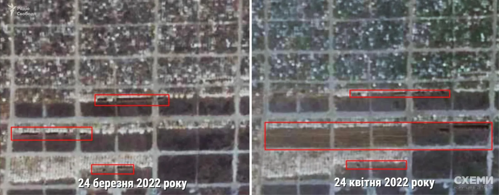Супутникові знімки за 7 квітня свідчать, що місце поховання збільшилося. Також частина з траншей – закопана.