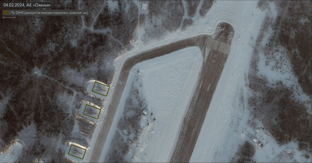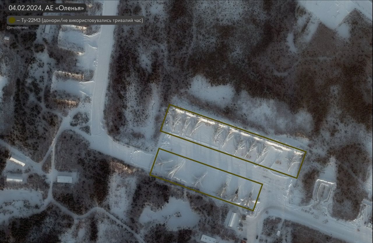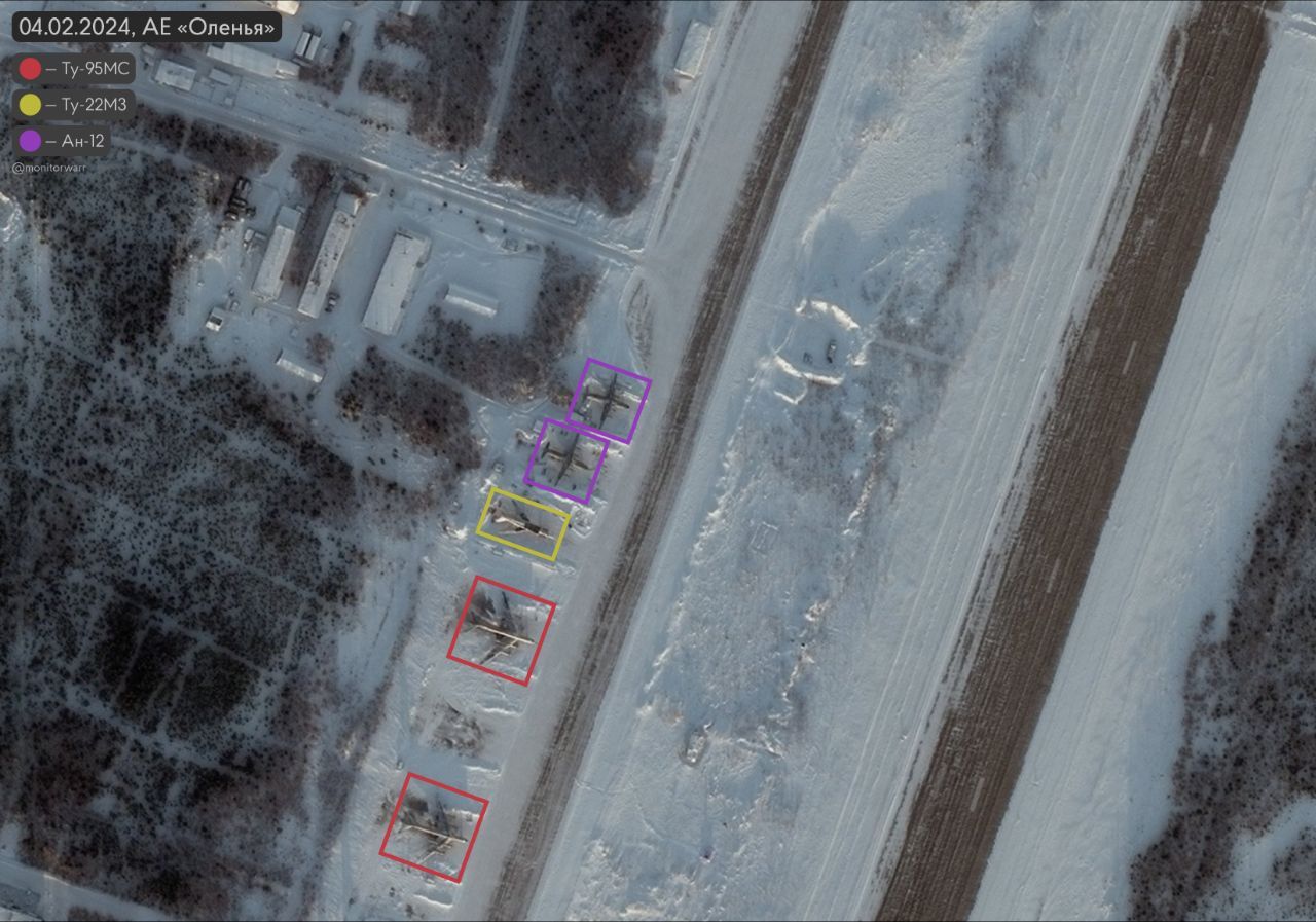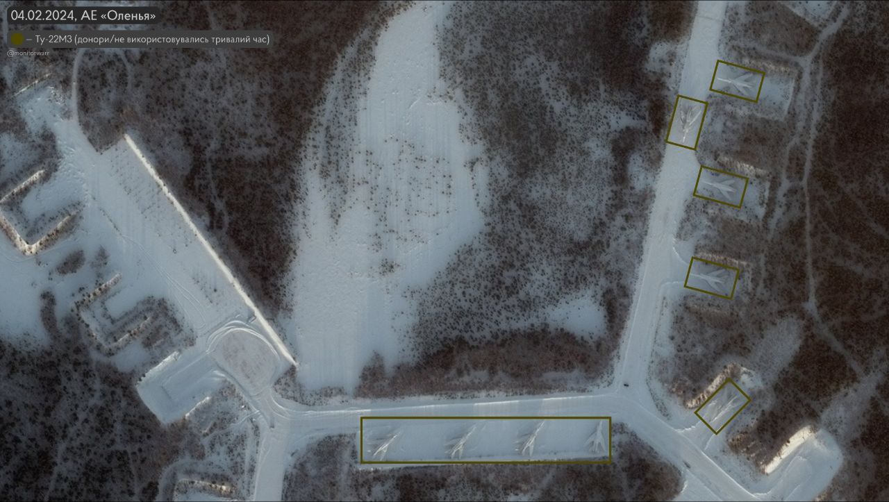 Нові супутникові знімки датовані 4 лютого 2024 року. На них видно, що на аеродромі "Оленья" перебували десятки російських літаків, серед яких: