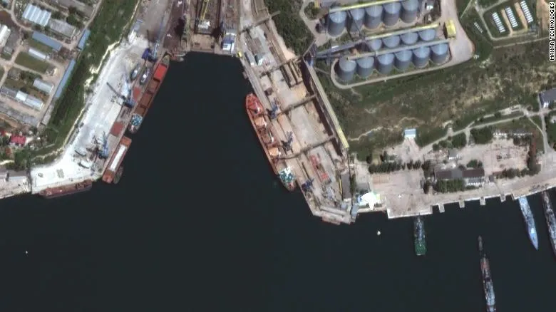 Maxar Technologies оприлюднили знімки зі супутника, датовані 19 і 21 травня. На них два російські судна "Матрос Позинич" і "Матрос Кішка" пришвартовані поряд з чимось на зразок зернових силосів, де зерно зсипається з конвеєра у відкритий трюм.