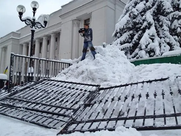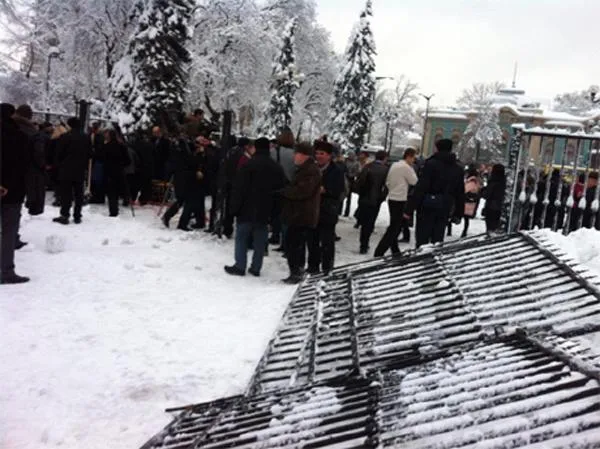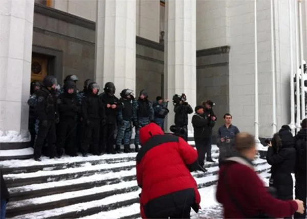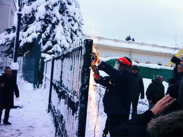 Загалом на підтримку свободівців прийшло близько 100 осіб. Вони намагаються пройти до будівлі через отвори, пропиляні свободівцями.