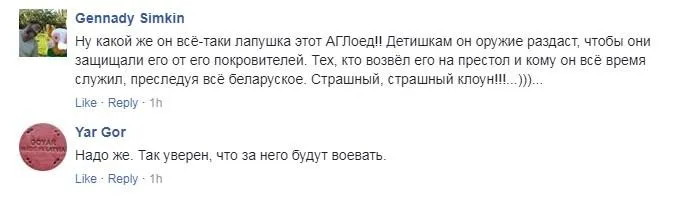 У соцмережах білоруси відреагували на заяви свого президента з сарказмом. У одному з повідомлень йдеться: "Дітям він зброю роздасть, щоб вони захищали його від його ж покровителів. Тих, хто звів його на престол і кому служив, переслідуючи усе білоруське".