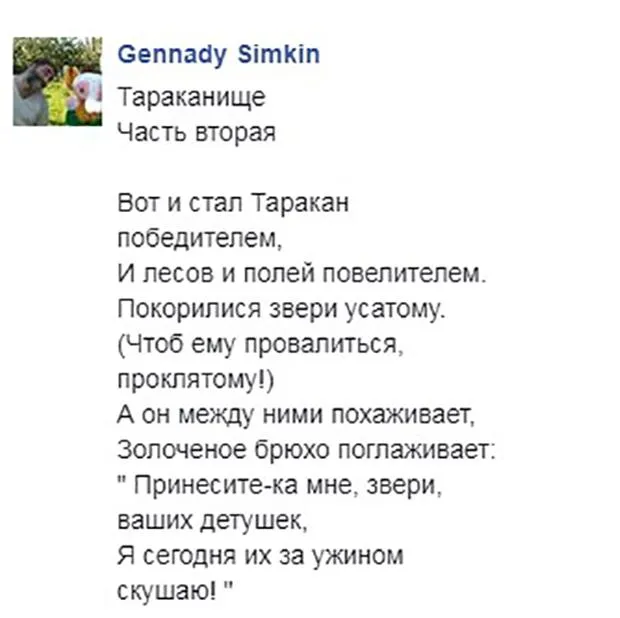 У іншому повідомлені – лише цитата із вірша Корнія Чуковського "Тараканіще". Автор вирішив, що до цих рядків і додати нічого.