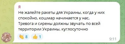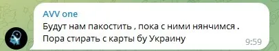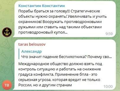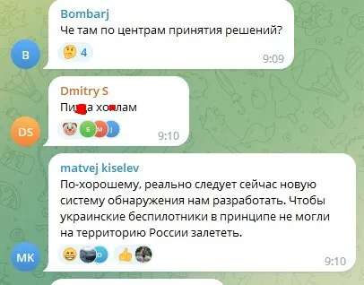 Разом зі згадками про врегулювання конфлікту росіяни закликають свою владу "стерти Україну з лиця Землі". Крім того, коментатори накинулись на редакторів телеграм-каналів, які вказували, що причина пожежі – падіння безпілотника. Натомість росіяни стверджують, що це була саме атака дронів.