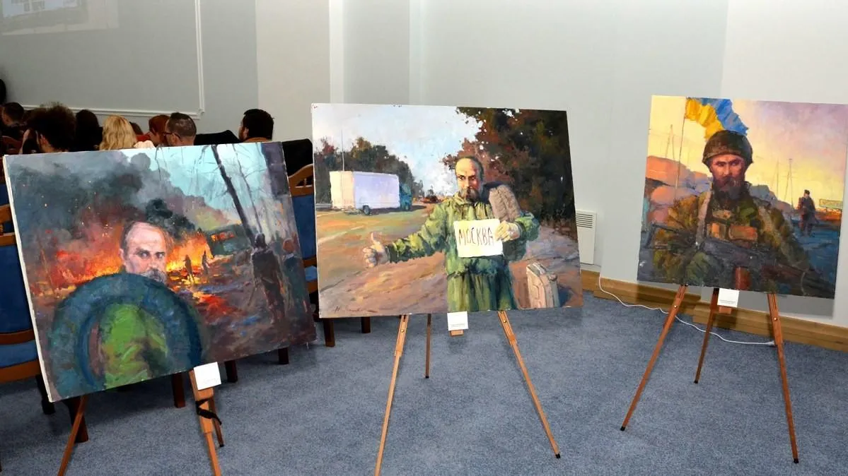 На цих картинах всім знайомий Тарас Шевченко, але у військовій форму захисників України готується до штурму Чонгару, несе покришки на Майдан, планує революцію у Москві та навіть "набиває" Путіну тату з всім відомим рефреном.