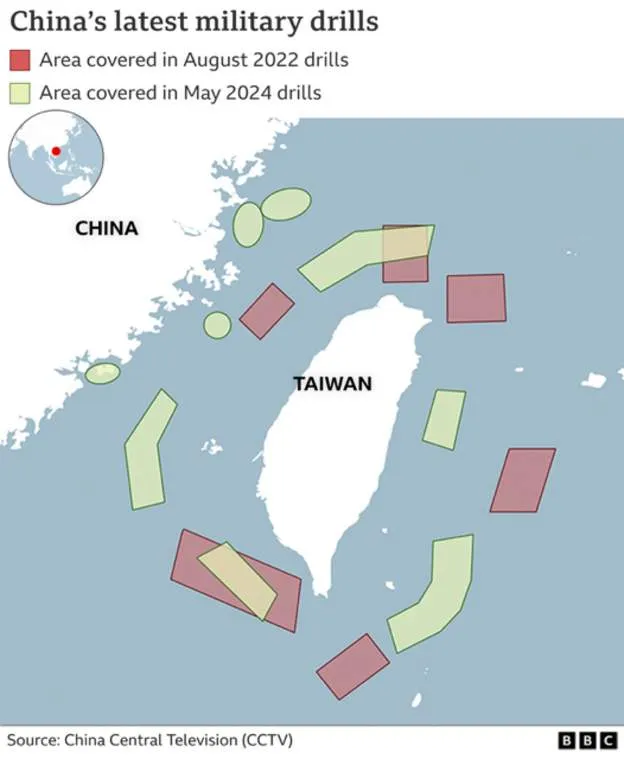 За даними BBC, порівнюючи тривалі навчання з тими, які Китай проводив навколо Тайваню ще у 2022 році, можна помітити, що обидва випадки передбачають оточення острова.