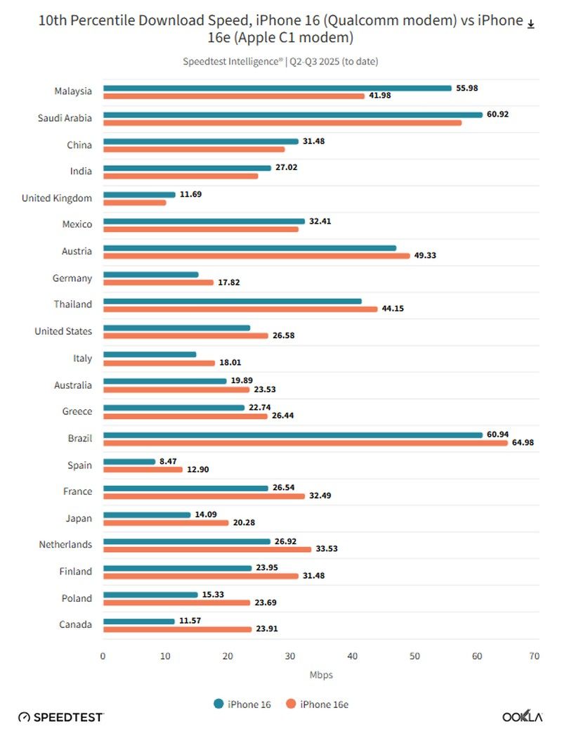 Результати тестів відрізняються залежно від країни та мобільного оператора. Наприклад, у 5G-мережі T-Mobile в США медіанна швидкість завантаження для iPhone 16 склала 317 Мбіт/с, тоді як для iPhone 16e — 252 Мбіт/с. Однак в Іспанії ситуація протилежна: iPhone 16e показав вищу швидкість — 139 Мбіт/с проти 110 Мбіт/с у моделі 16.