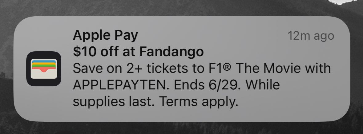 Користувачі iPhone розлютилися через push-повідомлення від Apple Wallet, у якому рекламувалася стрічка "F1 the Movie" – оригінальний фільм Apple з Бредом Піттом у головній ролі. Серед іншого, повідомлення містило пропозицію знижки в розмірі 10 доларів на Fandango для тих, хто купує два або більше квитків, повідомляє 24 Канал з посиланням на TechCrunch.