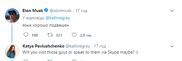 На цей пост і відреагував Маск. Цікаво, що він відповів російською мовою: "Язик добре підвішений".