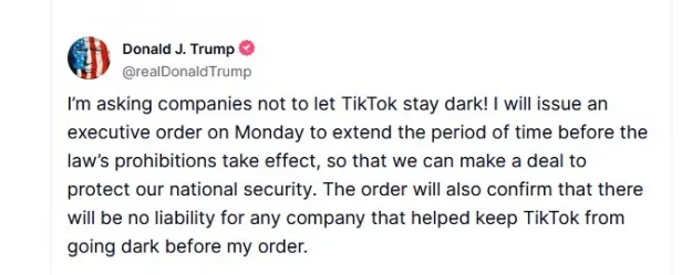 Трамп обіцяє вже у понеділок, після своєї інавгурації, видати указ про розширення періоду, після якого має набути чинності закон, що став причиною блокування TikTok. Це, за його словами, дасть можливість досягти угоди, яка забезпечить захист національної безпеки США.