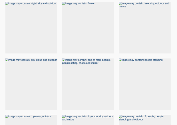 До прикладу, замість фотографії зі святкового застілля був опис: "зображення може містити: люди посміхаються, люди танцюють, весілля і в приміщенні". На іншому фото було написано: "зображення може містити: кіт" або "зображення може містити: текст"