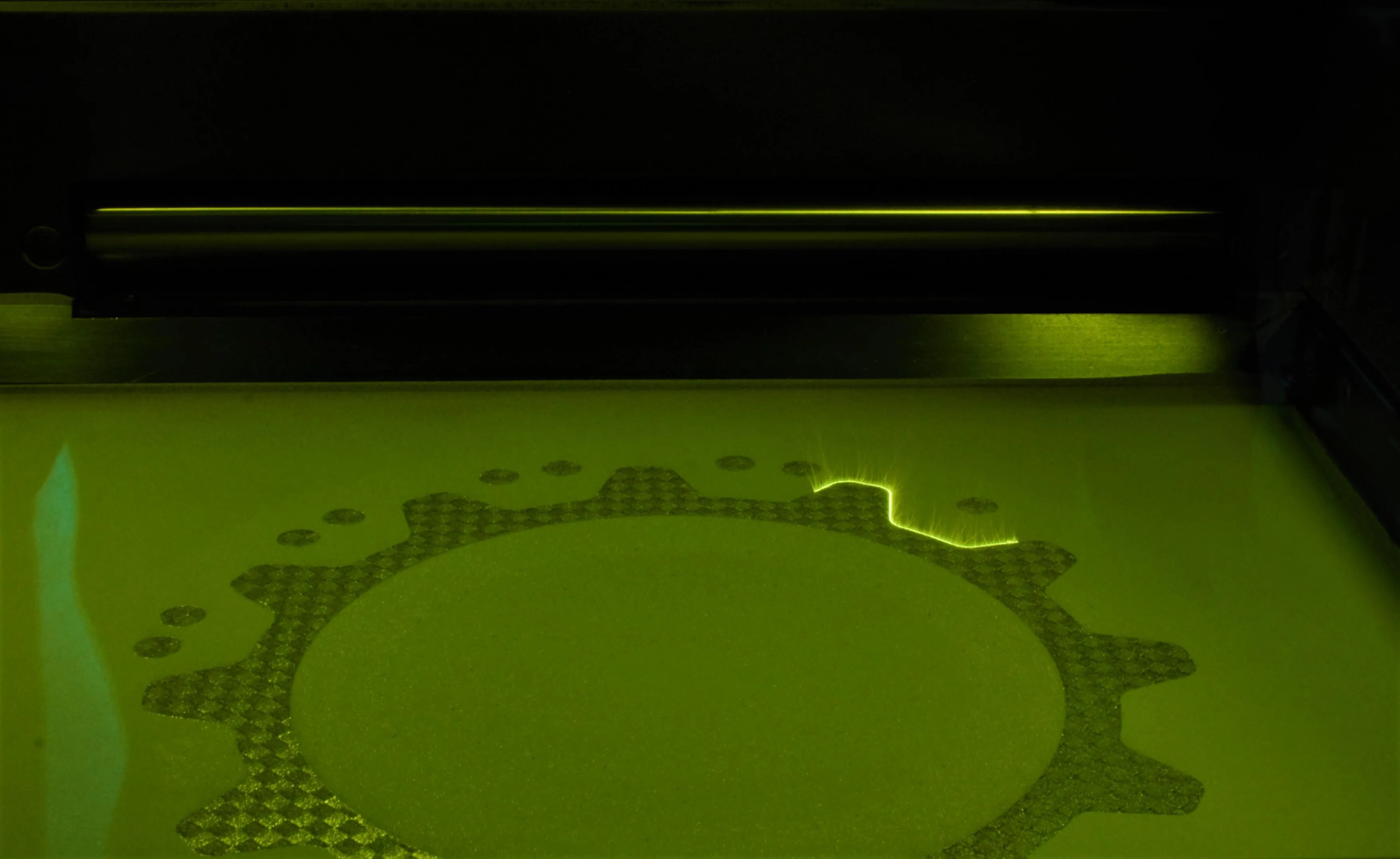 Всередині 3D принтера лазерний промінь плавить порошок, зварюючи його в заготовку.