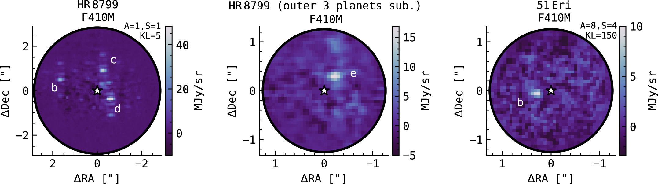 За допомогою коронографа "Джеймса Вебба" вдалося заблокувати яскраве світло центральної зорі HR 8799 і безпосередньо спостерігати чотири екзопланети цієї системи.