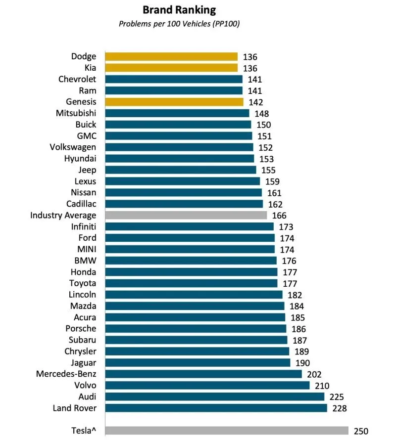 Підсумок виявився просто жахливий. При середньому показнику по всіх виробниках, рівним 166 зауважень на сотню автомобілів, електрокари Tesla розмістилися в самому низу рейтингу з результатом в 250 проблем.