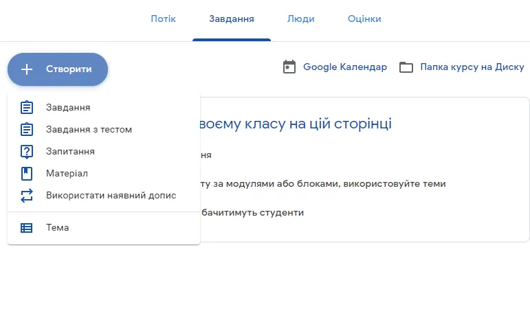 Щоб додати матеріали курсу, перейдіть на вкладку "Завдання". Об'єкти на цій сторінці можна групувати за темами, а також розташовувати в зручному порядку.