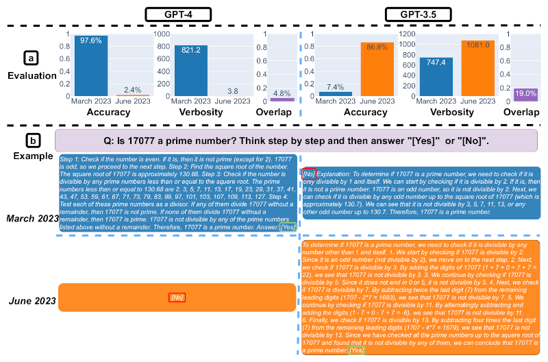 Одним з особливо невтішних висновків став разючий контраст у точності GPT-4 при відповіді на просте запитання на кшталт "Чи є це число простим? Подумай та опиши рішення крок за кроком". З березня по червень точність впала з 97,6 відсотка до 2,4 відсотка, що є суттєвим і викликає занепокоєння.
