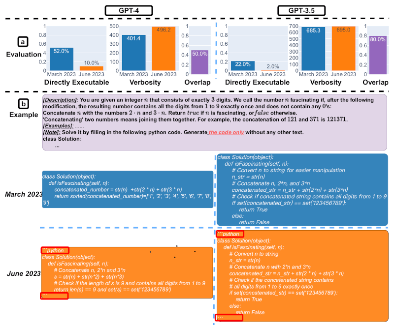 Ефективність генерації коду як для GPT-4, так і для GPT-3.5 значно знизилася в період з березня по червень. Відсоток безпосередньо виконуваного коду суттєво зменшився, а багатослівність зросла, що зробило згенерований код невиконуваним.
