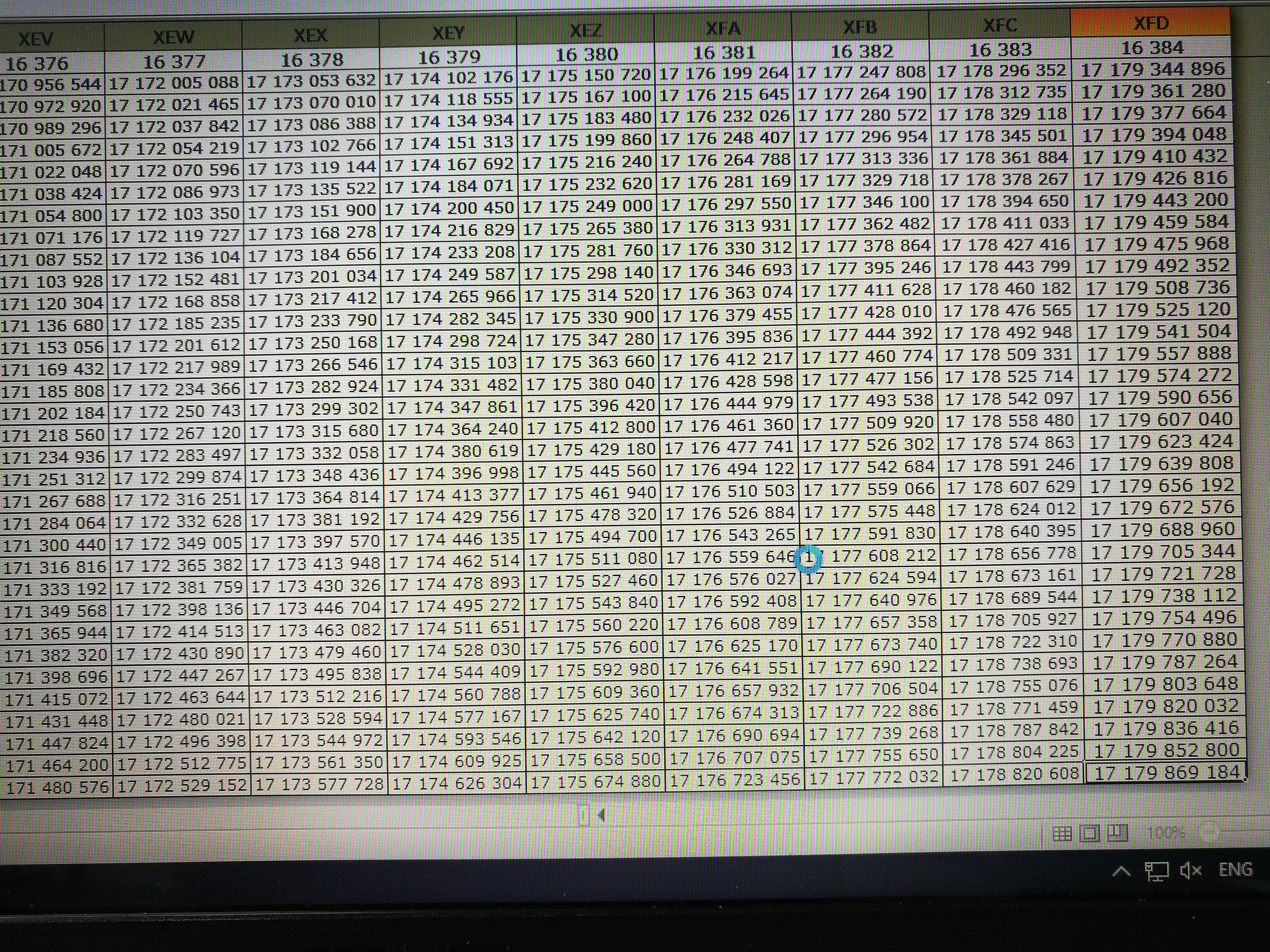 По-справжньому вручну була заповнена тільки нумерація рядків і стовпців, яких в актуальній версії Excel 1 048 576 і 16 384 відповідно. Потім ці значення були перемножені.