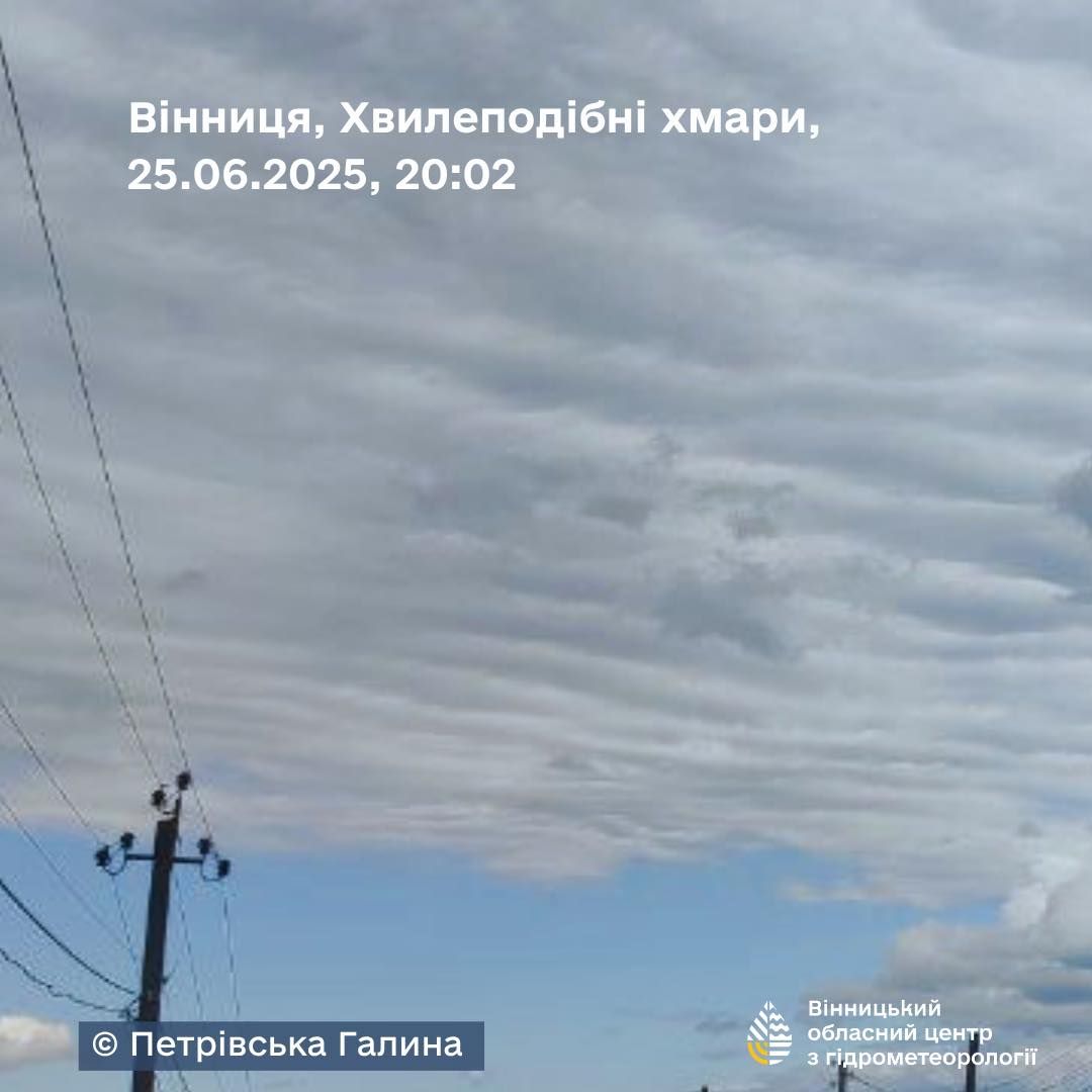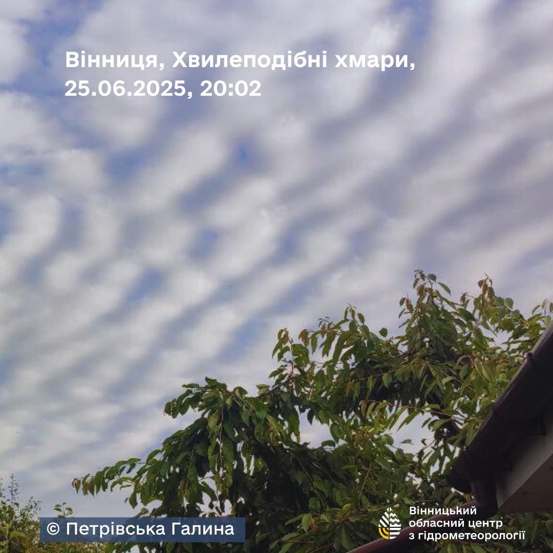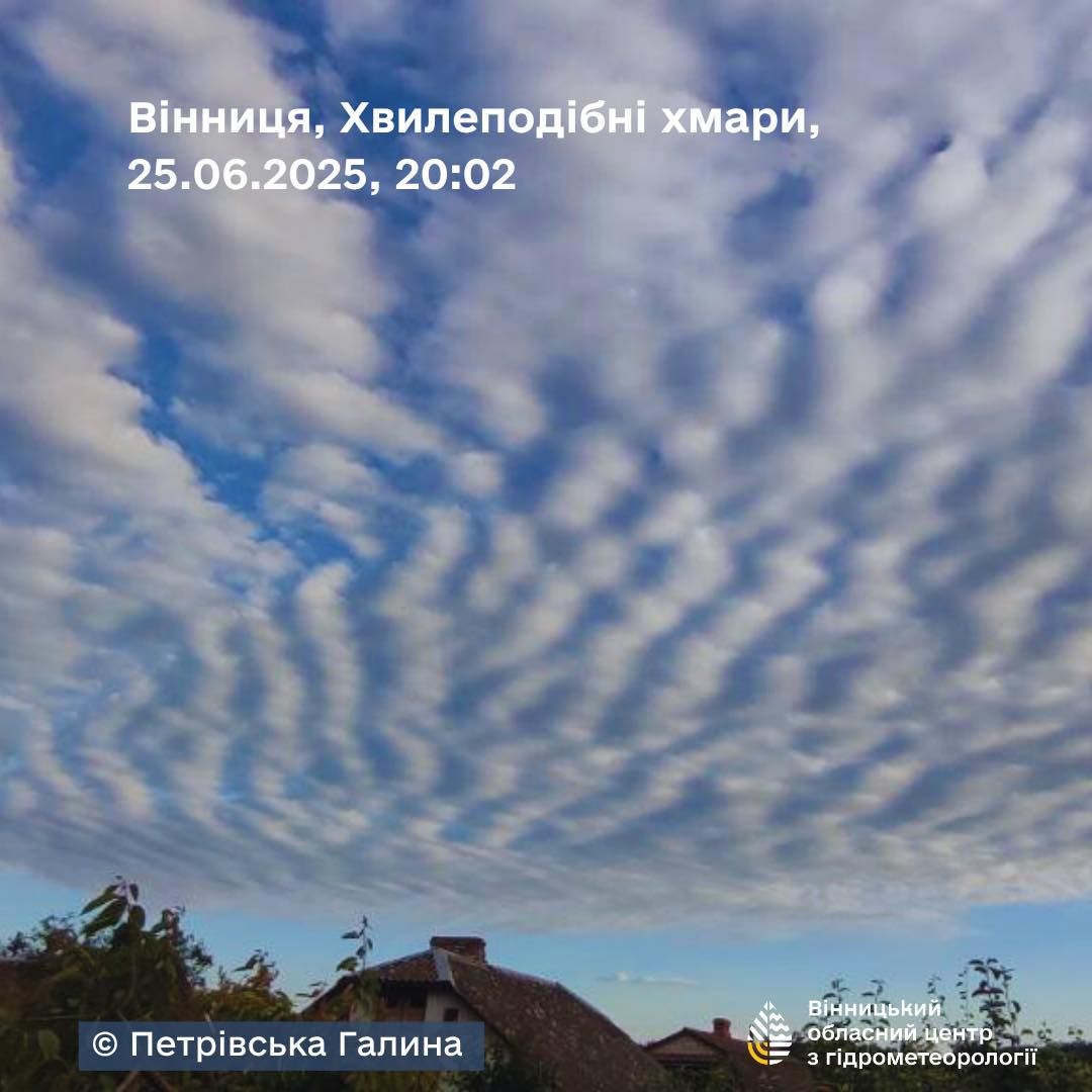Про це розповідає 24 Канал з посиланням на Вінницький обласний центр з гідрометеорології. 25 червня небо над Вінницькою областю прикрасило рідкісне атмосферне явище – хвилеподібні хмари Altocumulus undulatus.