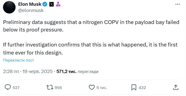 Як зазначив Ілон Маск у своєму дописі на платформі X, попереднє розслідування вказує на несправність у резервуарі високого тиску, розташованому в композитній оболонці вантажного відсіку космічного корабля Starship, інформує 24 Канал.