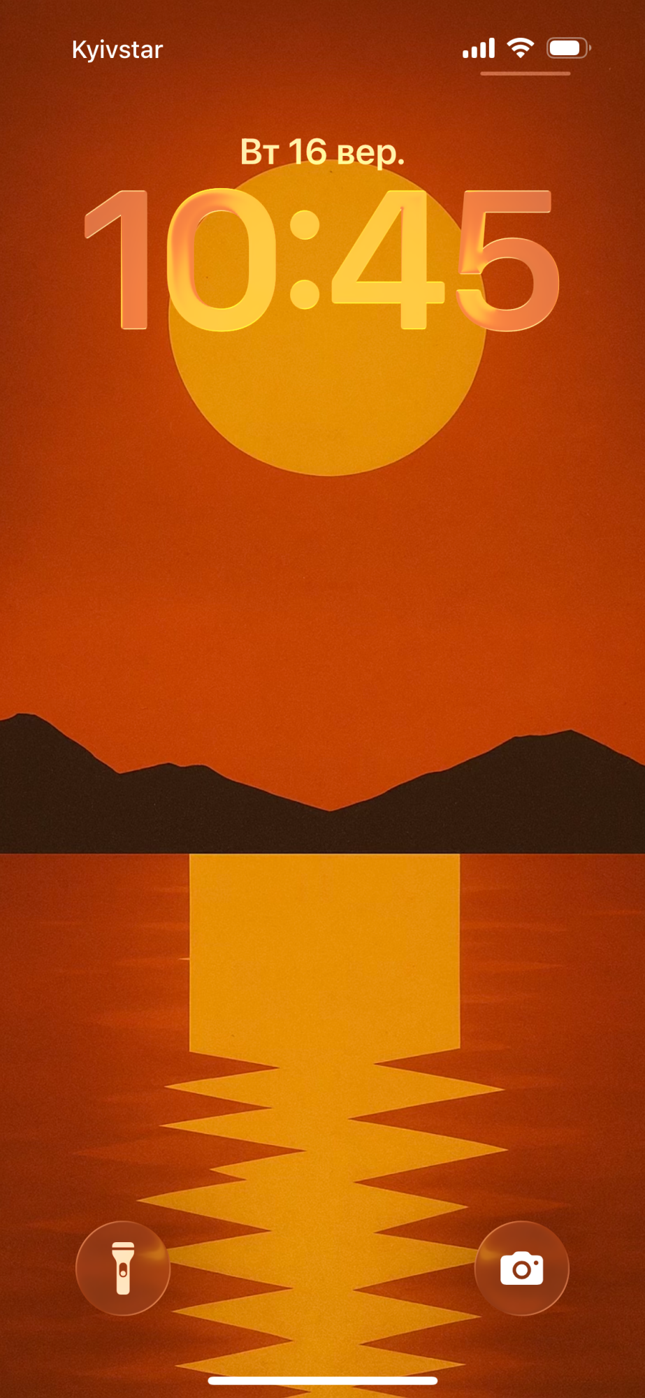 Новий екран блокування iOS 26 справді видається іншим, ніж раніше – Liquid Glass додає шпалерам просторової глибини (Spatial) і робить усі елементи прозорішими. Хоча я користуюсь кастомним зображенням, прозорим став лише годинник та дрібні елементи знизу. До цього звикаєш швидко.